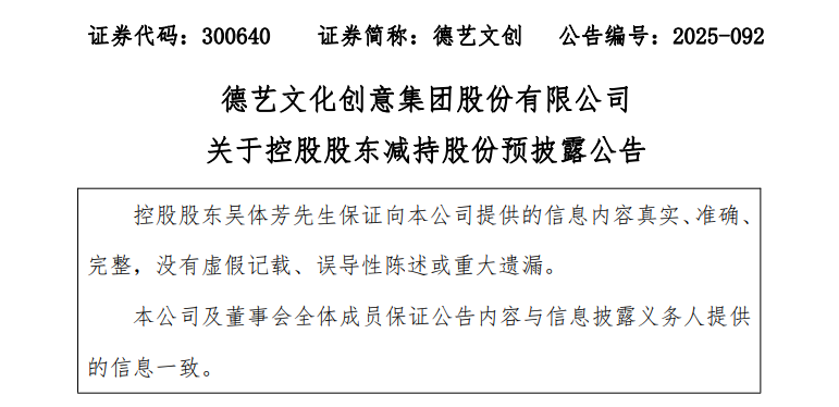 12月4日晚間,德藝文創(chuàng)(300640)公告稱,控股股東、實際控制人、董事長吳體芳計劃自公告披露之日起15個交易日后的3個月內(nèi),通過集中競價、大宗交易方式減持公司股份不超過621.99萬股,占公司總股本的2%。