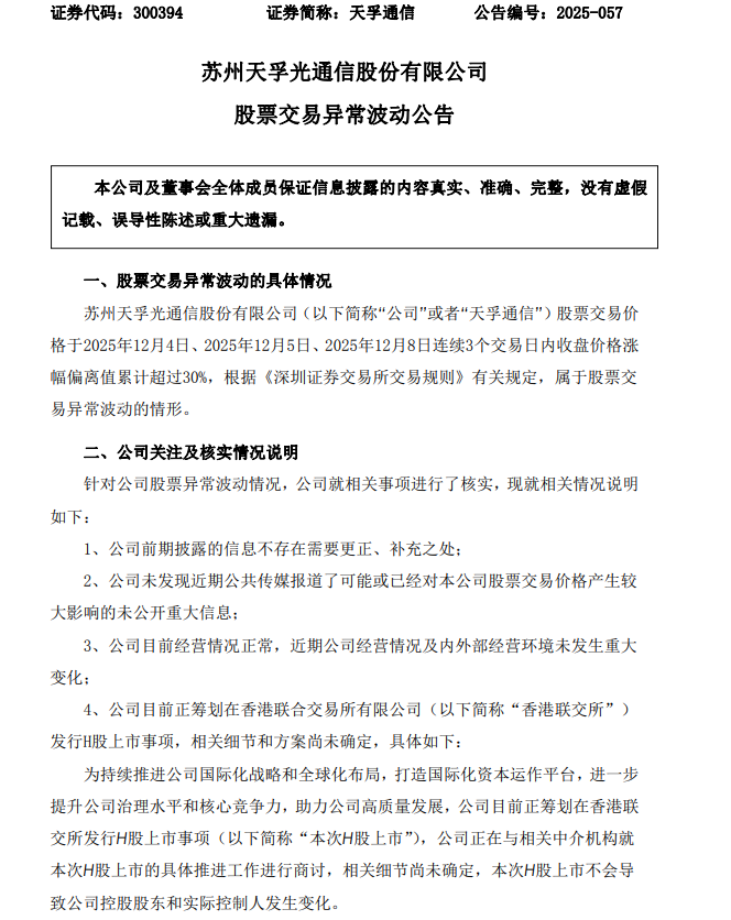 12月8日,天孚通信(300394)(300394.SZ)公告稱,公司股票交易價(jià)格連續(xù)3個(gè)交易日內(nèi)收盤價(jià)格漲幅偏離值累計(jì)超過30%,屬于股票交易異常波動(dòng)情形。公司目前經(jīng)營情況正常,除已披露信息外,公司內(nèi)外部經(jīng)營環(huán)境未發(fā)生重大變化。公司目前正在籌劃在香港聯(lián)交所發(fā)行H股上市事項(xiàng),相關(guān)細(xì)節(jié)和方案尚未確定,本次H股上市不會(huì)導(dǎo)致公司控股股東和實(shí)際控制人發(fā)生變化。