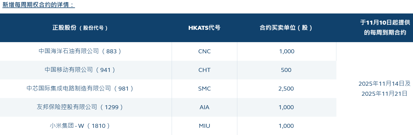 人民財(cái)訊10月9日電,香港交易所10月9日宣布,將于2025年11月10日起為五只股票期權(quán)類別新增每周合約。新推出的每周期權(quán)合約將與月度合約互補(bǔ),為投資者提供更具彈性及有效的短期風(fēng)險(xiǎn)管理工具。