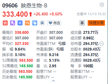 上證報中國證券網訊(記者 何漪)11月13日,映恩生物-B午后進一步走高,盤中一度漲超9%。截至15時33分,映恩生物-B漲8.6%,報333.40港元/股,成交額為8.96億港元。
