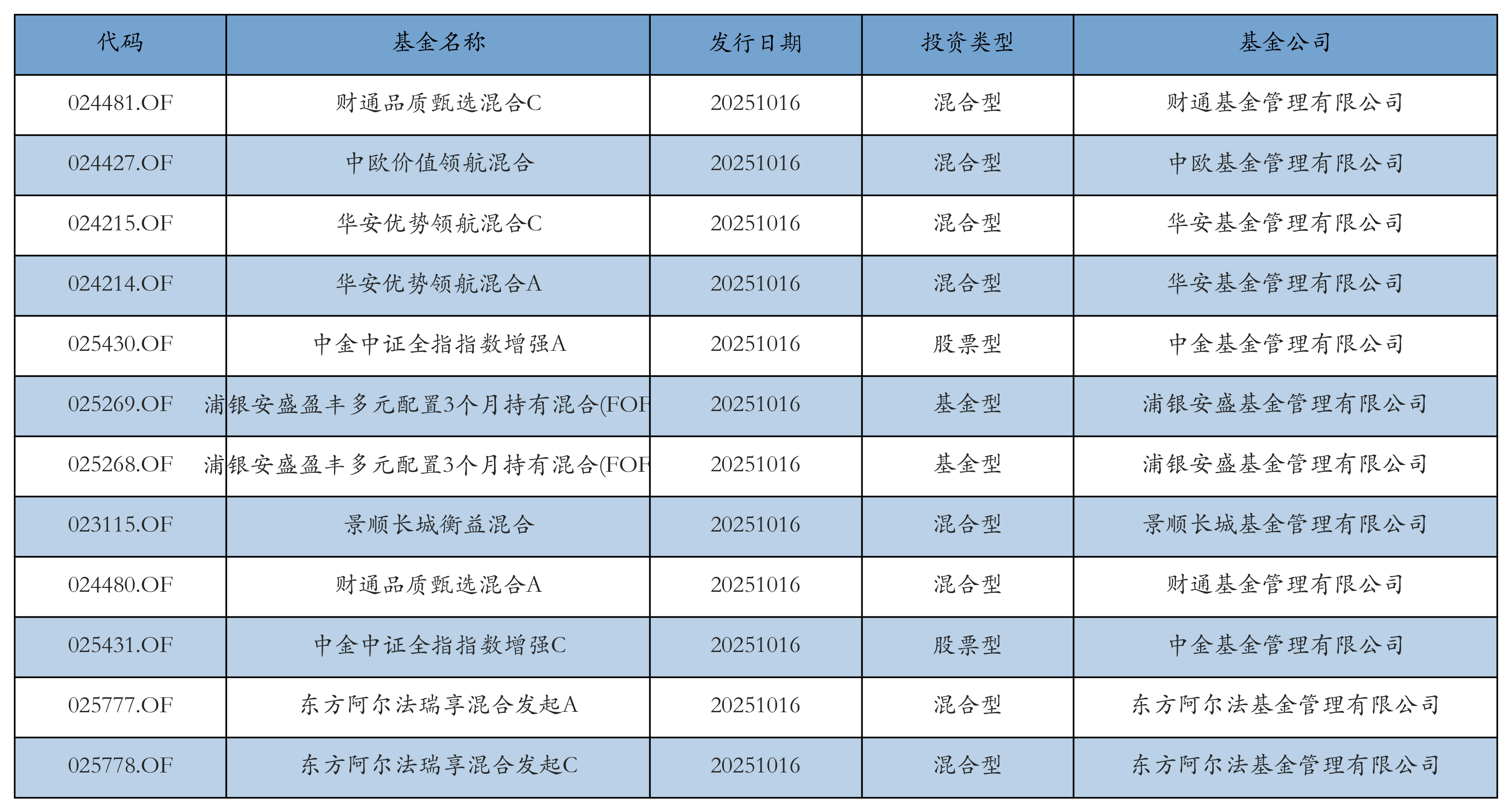 昨日有12只新基金發(fā)行,分別為:財通品質(zhì)甄選混合C、中歐價值領(lǐng)航混合、華安優(yōu)勢領(lǐng)航混合C、華安優(yōu)勢領(lǐng)航混合A、中金中證全指指數(shù)增強A、浦銀安盛盈豐多元配置3個月持有混合(FOF)C、浦銀安盛盈豐多元配置3個月持有混合(FOF)A、景順長城衡益混合、財通品質(zhì)甄選混合A、中金中證全指指數(shù)增強C、東方阿爾法瑞享混合發(fā)起A、東方阿爾法瑞享混合發(fā)起C,詳情見下表: